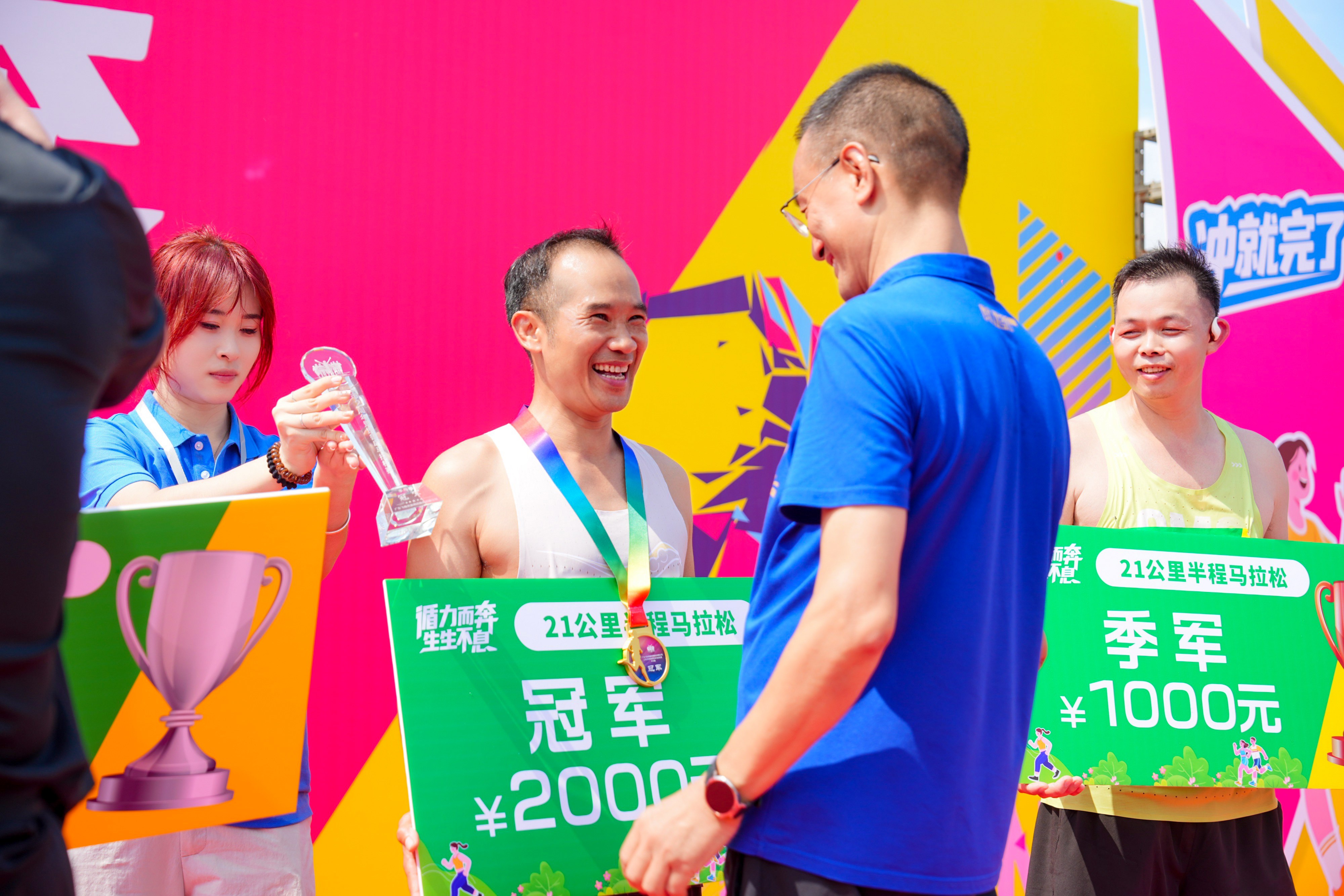 经过数小时的激烈角逐,各赛组的获奖选手陆续诞生。活动现场专门设置了颁奖环节,为5.2KM欢乐跑、13.8KM环岛马拉松、21KM半程马拉松的男子组与女子组前三名分别颁发荣誉证书与奖品。